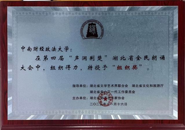 On the evening of November 16th, the Glorious Ceremony, Excellent Works Exhibition and Celebrity Recitation Concert of the 4th "Sound Nourishes Jingchu" Hubei Provincial Public Recitation Contest were grandly held at Wuhan Linkong Port Grand Theater. Students and teachers from the International Education College of our university won multiple awards in this event, and Zhongnan University of Economics and Law earned the "Organization Award".